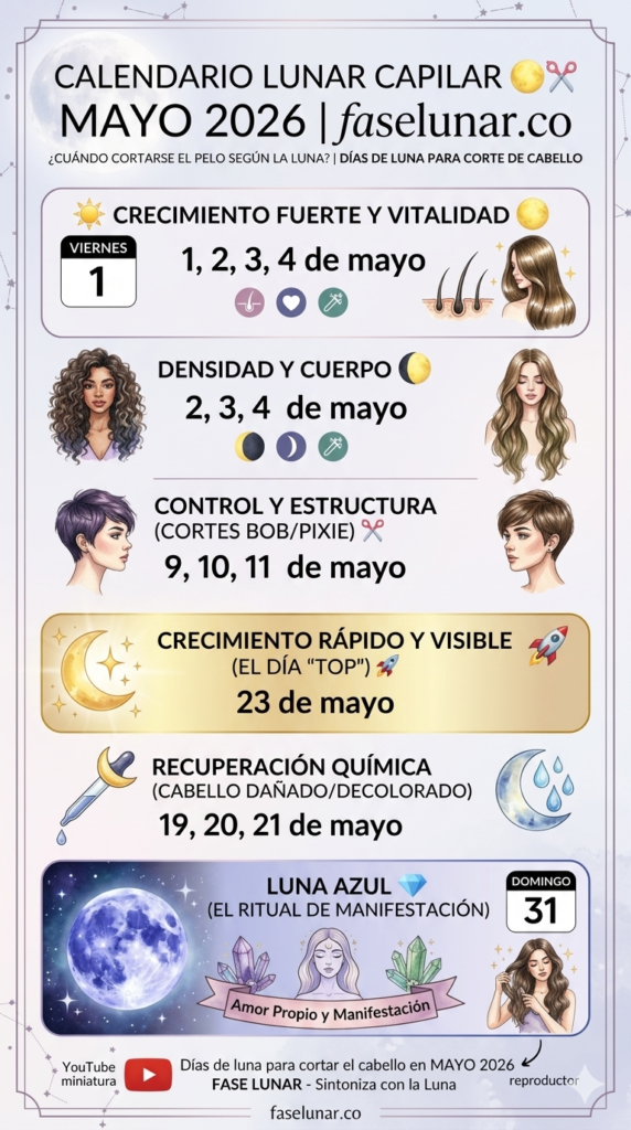 Bienvenidos al calendario lunar capilar de mayo. Este no es un mes cualquiera; es un mes de expansión, de crecimiento visible y de energía que se manifiesta . En mayo de 2026 ocurren dos lunas llenas: la tradicional Luna de las Flores y la imponente Luna Azul .